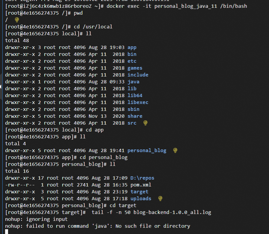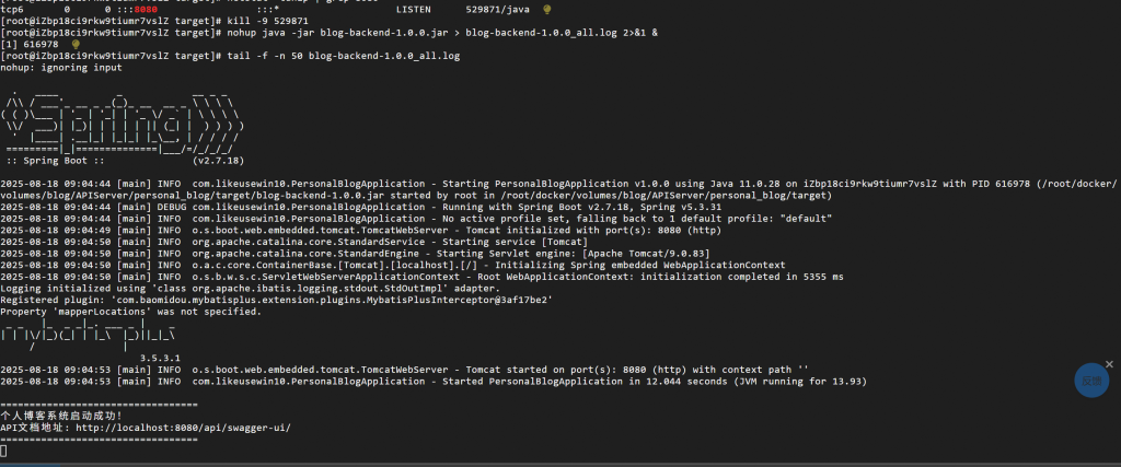 如果还是显示[root@4e1656274375 target]#tail -f -n 50 blog-backend-1.0.0_all.log是之前的