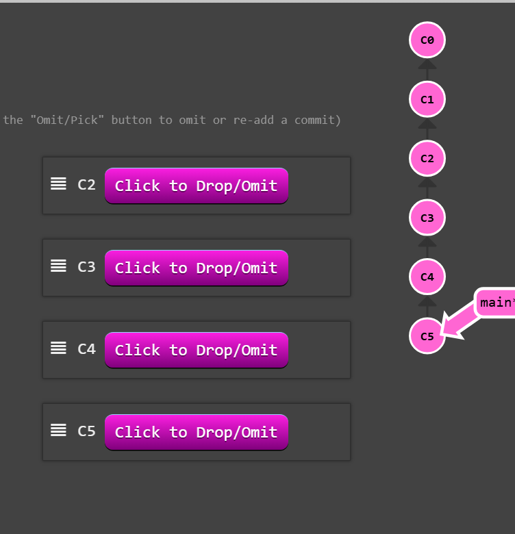 git rebase -i c1- Drop/Omit:丢弃该提交,选择c2,c3